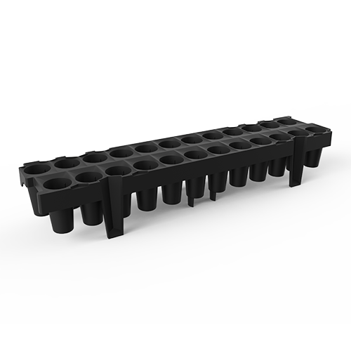 The special shape of this tray ensures an equal planting distance, even with two trays in succession. This assures plant uniformity. Because of the firm alignment of the trays, the cutting of the runners will go faster. The tray has a space of 3 centimetres under the cups, so there is more distance between the ground and the bottom of the cup.